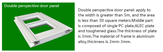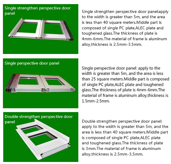 ![]() Commercial perspective door/industry perspective door:This is the introduction of foreign advanced technology, combined with many years of practice and the development of a new generation products.This product is widely used in the automobile 4S shop, the equipment exhibition hall, the fire door, the shopping malls and other occasions. The door body has a combination of aluminum alloy and polycarbonate glass, you can also use acrylic plate, or tempered glass.With a higher transmittance, make the architectural appearance more beautiful. Can provide personalized design: high transmittance is more conducive to the improvement of working environment. Product feature ★High quality aluminum alloy profile ★High strength anti impact PC plate ★High speed running motor ★Safety anti fall device ★Show elegant taste of building Industry perspective door 【1】door panel (1)The structure of the door is composed of the middle window, the bottom door and the top door.The bottom door panel is one or two polyurethane foam board.The middle part is a perspective door panel composed of aluminum alloy frame and carbon ester plate inside.The top can be selected according to the actual need to make a foam board or perspective door.The aluminum frame of the perspective window and the top or bottom door panel can be made of a variety of standard colors. (2)The door can also be made into the whole perspective door panels. (3)According to the color of the buildings, aluminum frame can be made of various standard colors. (4)Frame of the door panel:This is our company's patented aluminum profile, profile specifications can be based on door size and wind resistance to select the appropriate model, size, grade profile.And there are a variety of anti clip hand function profiles (5)Perspective panel:Using the German raw materials of polycarbonate PC plate, thickness of 3mm and 5mm , can choose according to the width of door and width of window. Excellent anti ultraviolet function, The impact force is 100 times of toughened glass. If uses toughened glass, high transparency, not easy to scratch, easy to clean.Always bright and clean like new. 【2】hardware:The bottom bracket, center hinge, roller, adjusting bracket, etc., are stamped with 2.0mm galvanized sheet. 【3】mode of operation:There are many choices according to the construction. standard 90°slide up (2)hoist at high altitude (3)Middle beam balance vertical hoist (4)top torsion vertical hoist 【4】safety device:1. Door bottom airbag protection device(When the door body fell, once encountered obstacles, the door will automatically open back.) 2. infrared function (When the door is falling, a person or an object through the doorway, blocking the infrared, the door will open.) Industrial door series (vertical lift, sliding, rolling, translation), the product is widely used in all kinds of industrial workshop, workshop, warehouse, computer room, garage and other occasions. In the use and control, we provide you with a variety of manual and automatic control systems to meet the user's opening and closing requirements for industrial doors. In the reliability, for the company,all parts of the door are based on the user's need to design and product.Most of the parts are produced by their own ideal door industry, provide with comprehensive quality control and excellent performance.Door is specially designed for industrial doors, composed of the high quality surface process treatment of color steel complex plate, with a variety of colors, to meet the needs of different users. Door panels are produced in the continuous production line, to ensure the balance of quality, and frequently quality inspection of the door is impeccable to the quality of door panel. In convenience, manually open and close the sliding door is very easy, because 90% of the weight of the door has been balanced by the hammer or spring. These springs are based on each door body by scientific calculation separately prepared. LIRONG industry can develop and produce electric door equipment, motor, cable and single control element. Technical data: ![]() ![]()